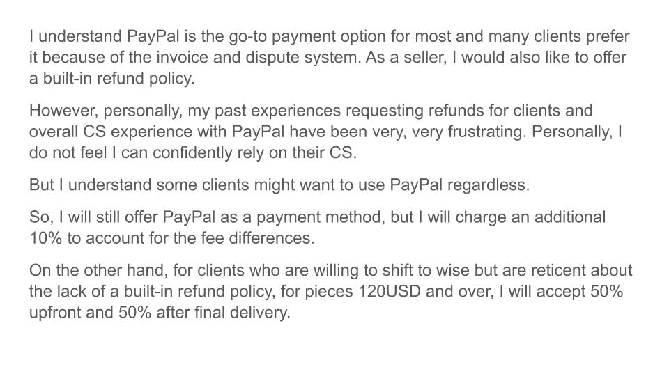 - Exceptionally for Wise payments, for pieces 120 USD and over, payment 50% upfront and 50% after final delivery is acceptable.